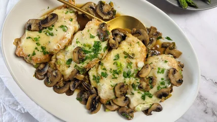 The main ingredient in this dish is boneless, skinless chicken breasts seasoned with salt and pepper and dredged in flour. Olive oil and butter are needed to sear the chicken for a crisp, golden crust and buttery flavor. Cremini mushrooms, garlic, Marsala wine, and chicken broth make up the slightly sweet and umami-forward sauce. For the topping, you'll use fontina, Parmesan, and scallions. A parsley garnish adds a verdant note to the finished dish.